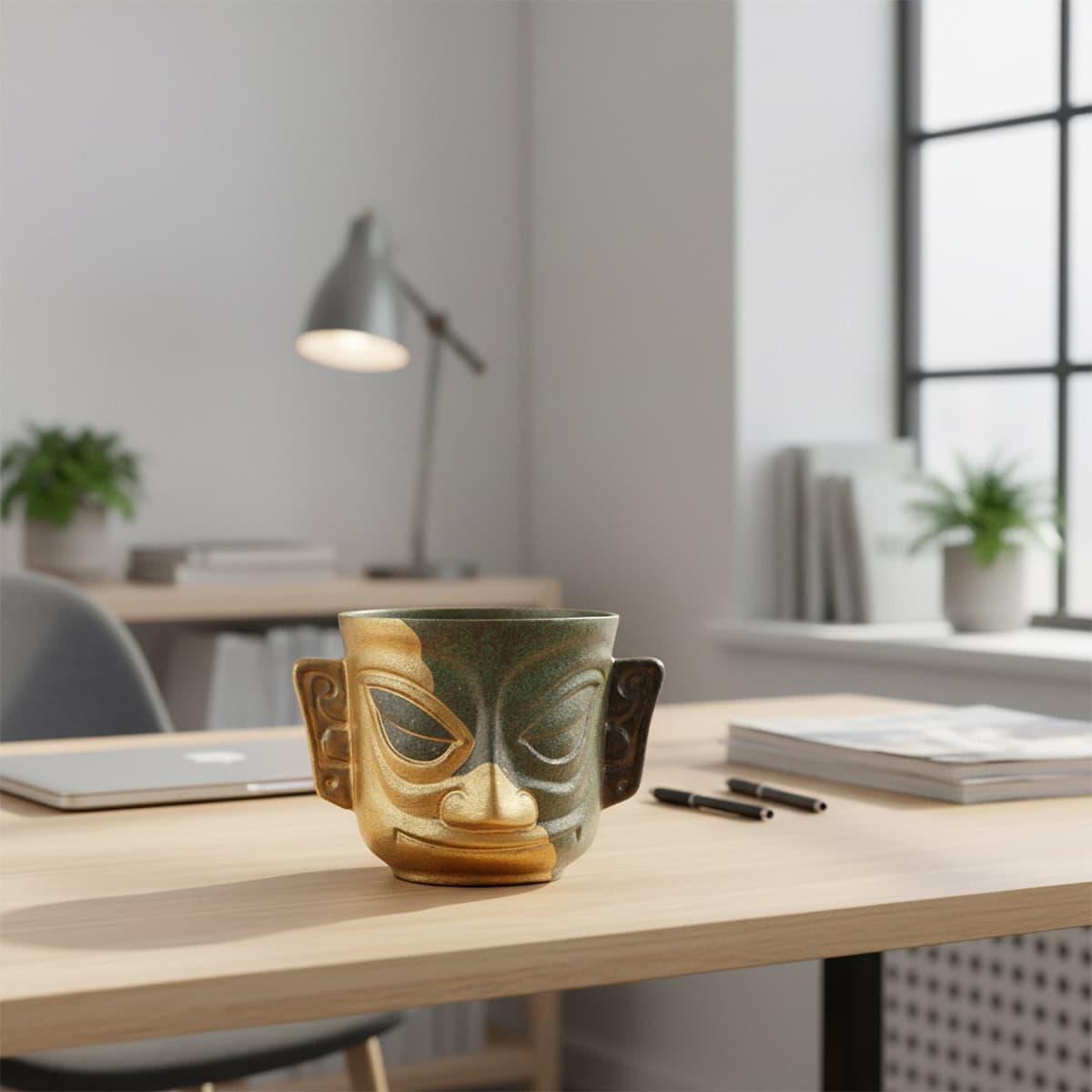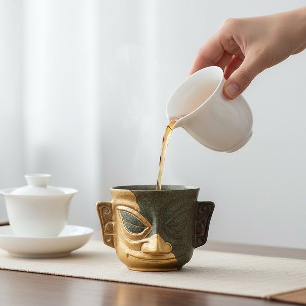 Inspired by the iconic half gold-foil mask unearthed at the Sanxingdui archaeological site in March 2021, this Chinese porcelain tea cup brings the mystery and splendor of the Ancient Shu civilization into your daily ritual. We recreated the striking “half-face” mask motif in ceramic form with a bold yet refined presence, designed to catch the eye at first glance and make every sip feel like a quiet encounter with history.