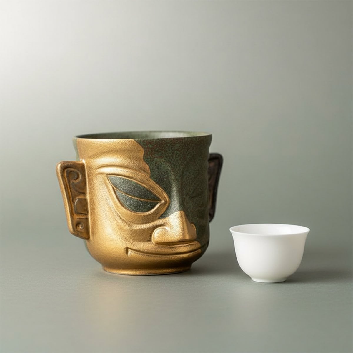 Chinese Porcelain Tea Cup – Sanxingdui Gold Mask Inspired Teaware, Ancient Shu Collectible